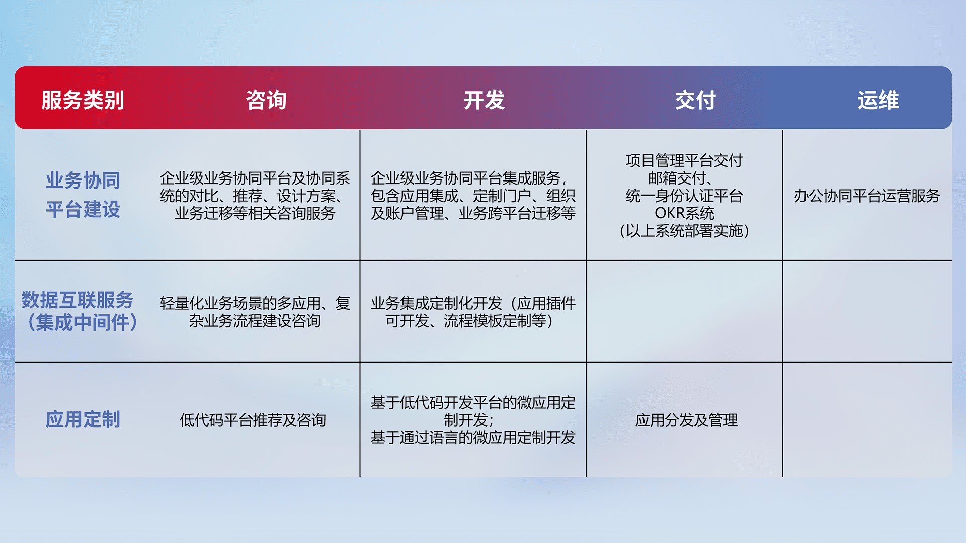 针对钉钉、、企微、、、IDaas等平台级产品提供产品的规划、、方案、、、交付、、、定制化开发等服务,,,,实现如统一协同办公、、智能客户服务、、、、混合会议管理、、、、智能数据查询、、、、等业务场景,,实现数字化转型。。