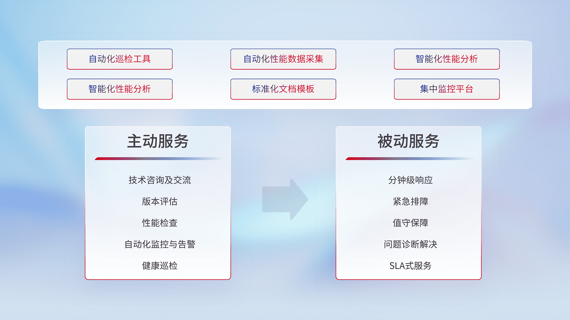 智能化工具和标准化文档,,,,保障服务质量,,,提供主动服务(包含技术咨询、、、、版本评估、、性能检查、、、、自动化监控与告警、、、健康巡检)和被动服务包含(分钟级响应、、、、紧急排障、、、值守保障、、问题诊断解决、、、SLA服务)。。。